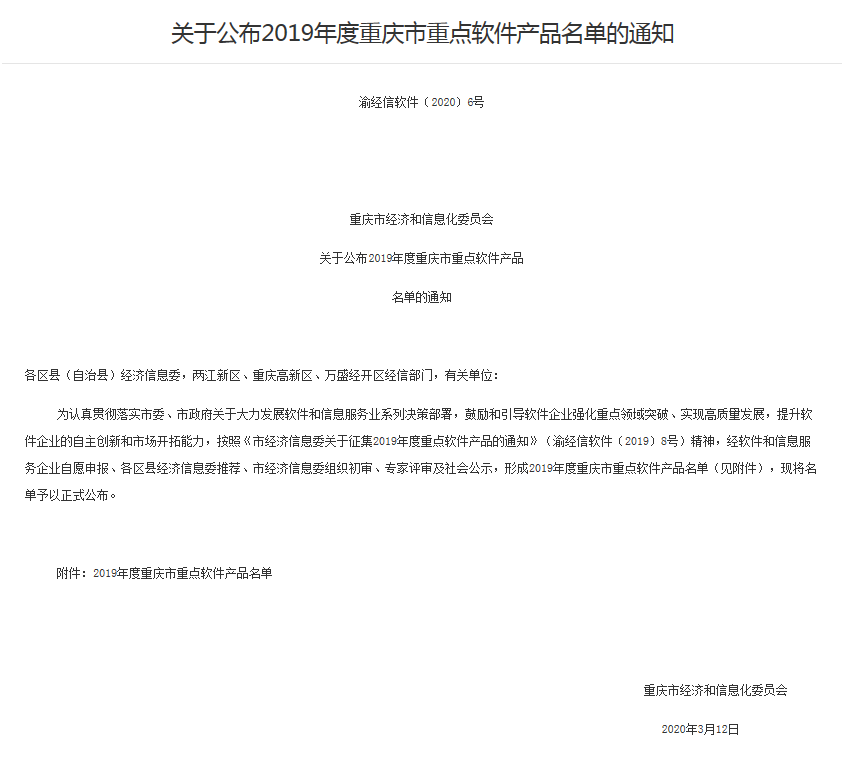 近日,重庆市经济和信息化委员会发文公布“2019年度重庆市重点软件产品名单”,经过多方评审,商勤自主研发的”环境应急大数据平台”软件产品成功上榜。